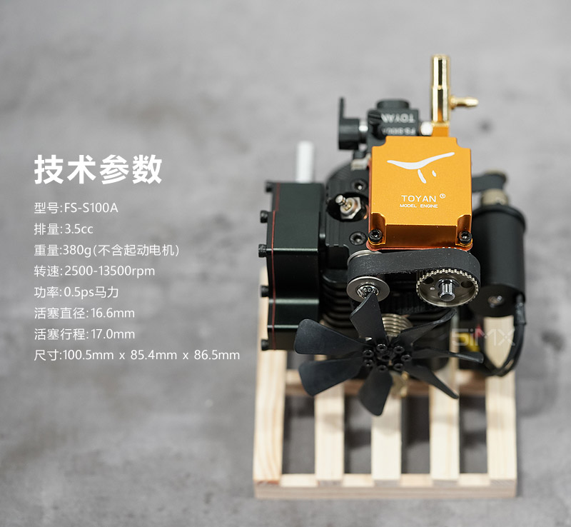 发动机为单缸4冲程,排气量3.5cc,转速2500-12500RPM。高精度正时皮带传动,运行平稳安静;燃料为混合甲醇( 25%-35%甲醇硝基专用油 ),发动机为7075航空铝合金材质,发动机爱好者喜爱的收藏品。该发动机需要配套的油箱、油管、启动电调等配件才可启动,可用于改装模型越野车、大脚车等,或配套相应配件进行启动等。