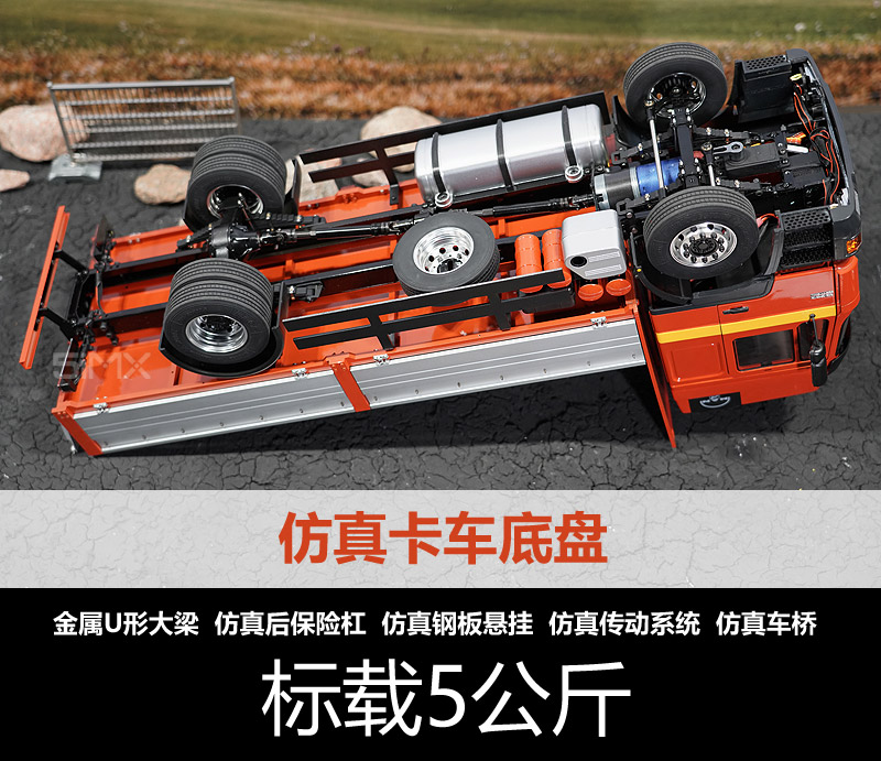 1/14比例,铝合金压铸工艺金属车壳,后斗5块栏板可打开,驾驶室可前翻 ,两侧车门可打开,前面罩可打开,驾驶室内有丰富的细节,金属大梁,前导后驱,有差速器,仿真双层钢板悬挂,铝合金轮毂,仿真橡胶轮胎,仿真传动系统,带倾角无动力转向桥,仿真大油箱。